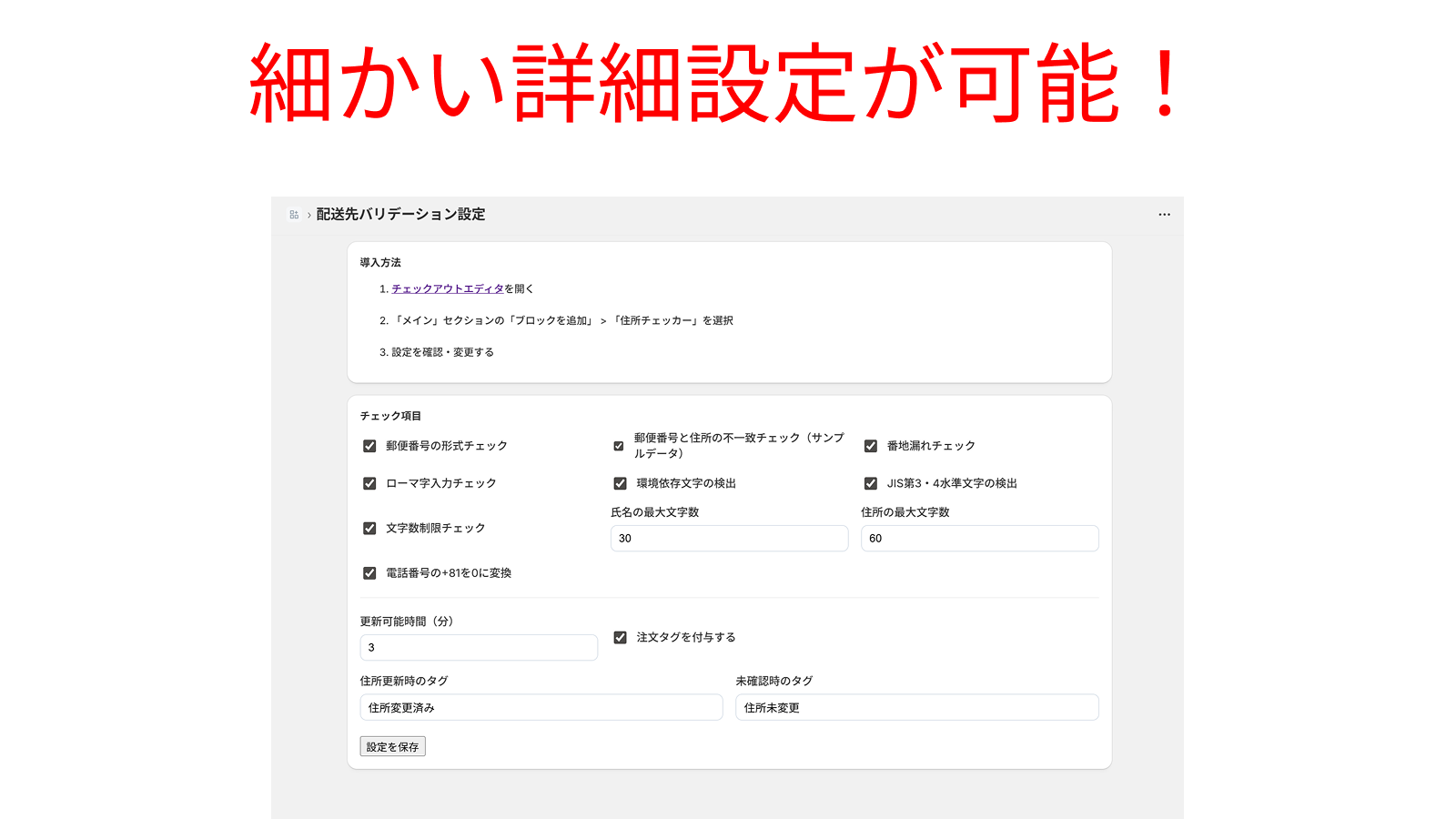 日本の住所形式に対応した配送先住所自動チェックアプリです。注文時に配送先住所を自動的に検証し、住所の入力ミスや不完全な住所を検出します。郵便番号からの住所自動入力機能や、都道府県・市区町村の整合性チェックなど、配送エラーを未然に防ぐための機能を提供します。