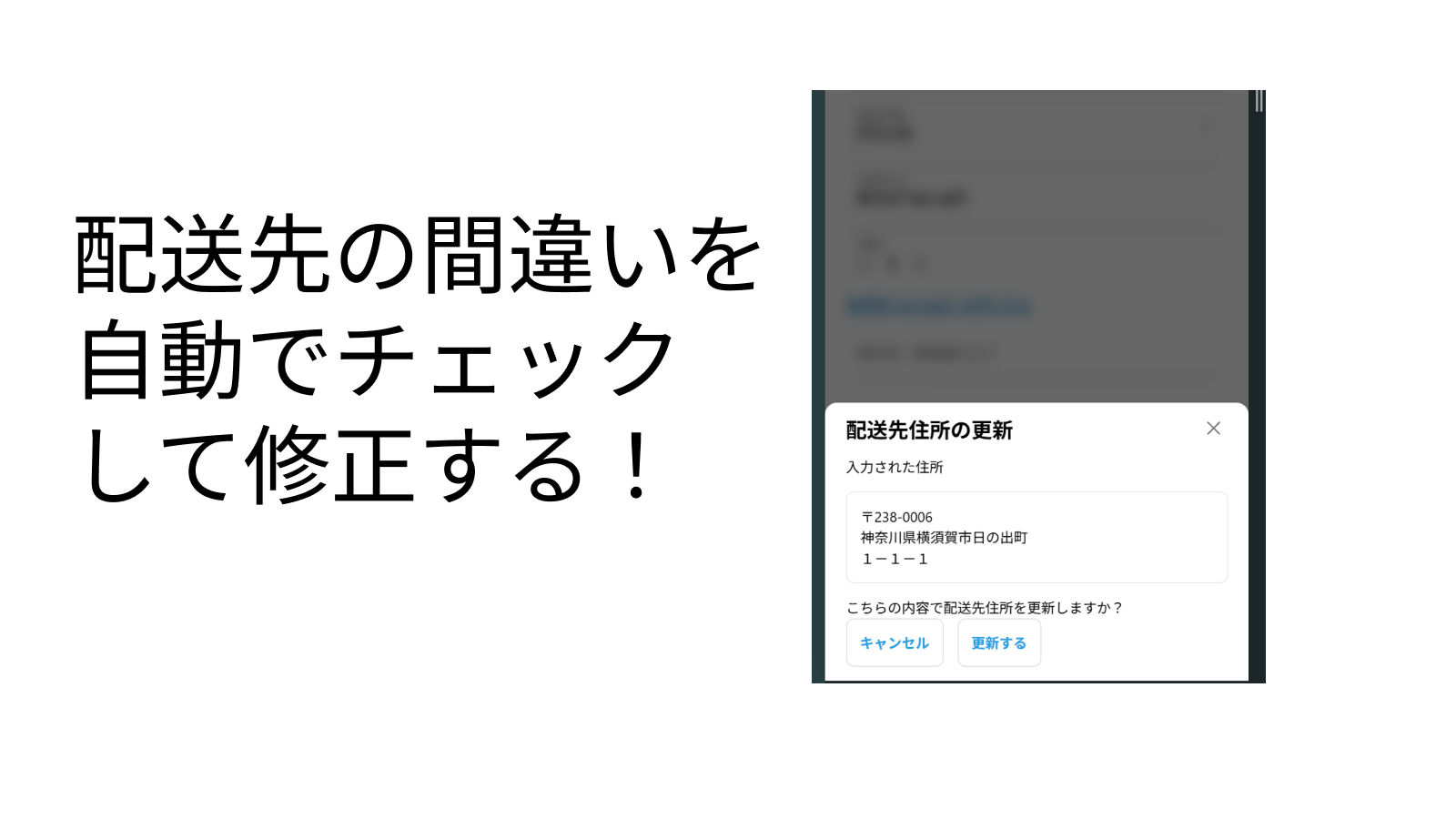 日本の住所形式に対応した配送先住所自動チェックアプリです。注文時に配送先住所を自動的に検証し、住所の入力ミスや不完全な住所を検出します。郵便番号からの住所自動入力機能や、都道府県・市区町村の整合性チェックなど、配送エラーを未然に防ぐための機能を提供します。